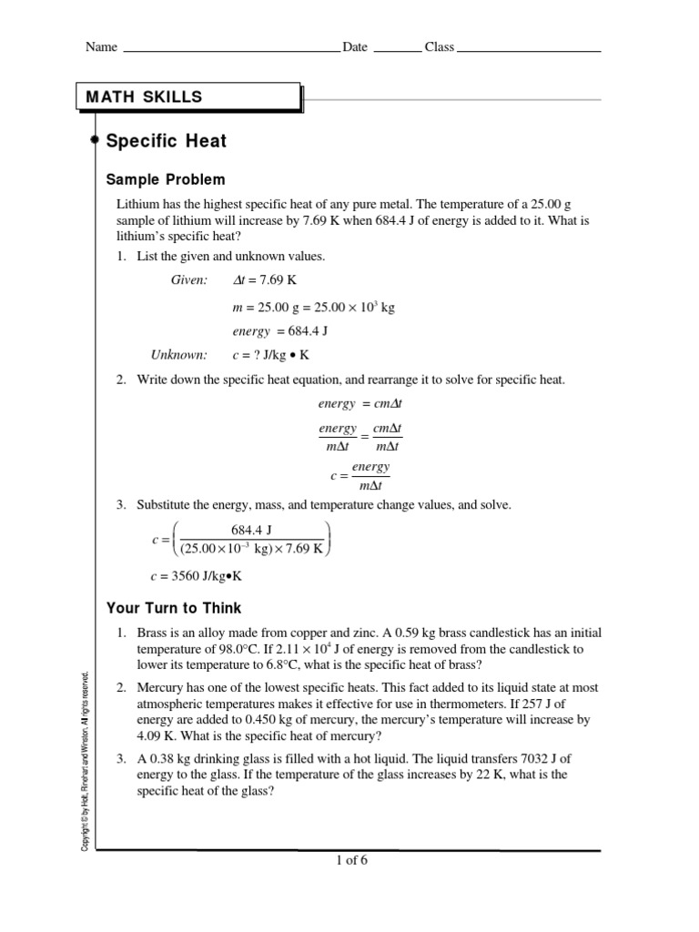 Skills Worksheet Math Skills Specific Heat Answer Key